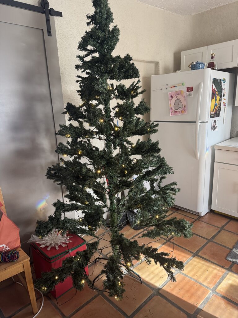 The lights on top don’t even flicker, her metal limbs are bent, her plastic needles covered in dust, a full foot or more too tall! She wobbles with a base that is tinged with just a bit of rust. When pruning her branches I even found the scrap of the top of an ornament, chipping away, tangled underneath. I’m no stranger to ‘expectations vs. reality’ when it comes to ordering online – but this was a little silly.