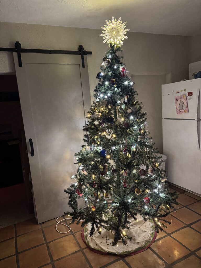 No. She wasn’t going to be tossed away again. We got out our ornaments, got out an extra strand of christmas lights, and my mom and I… we got to work. We gave her the extra lights to make up for the ones that had gone dim. We put our most loved and precious ornaments up on her branches. Some were commissioned by my grandma, for both I and my mom. Little memories of bygone years, and yes… some just lightly aged bobbles that just look pretty. Then, as a final touch, a sprinkling of those plastic icicles.